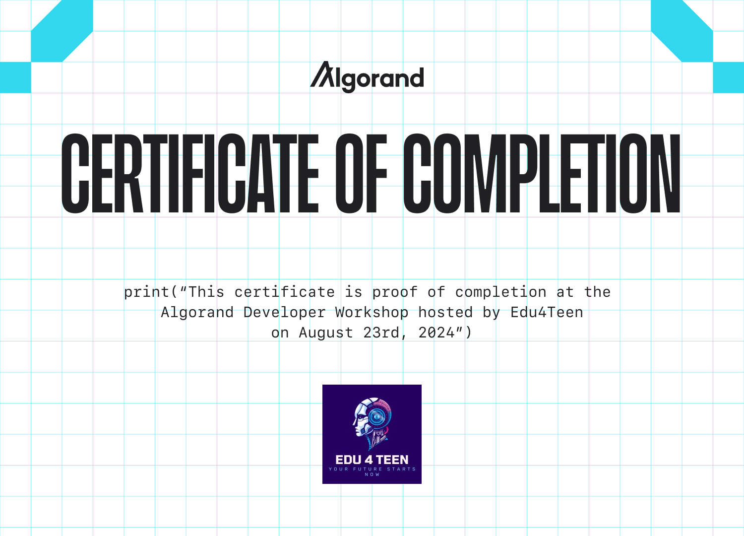 This is your Algorand Developer Workshop Certificate of Completion!
